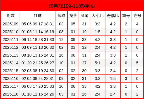 当期红球号码大小比为2:4,三区比为3:1:2,奇偶比为2:4,重号未出现,连码开出10,11。蓝球开出小奇数03。